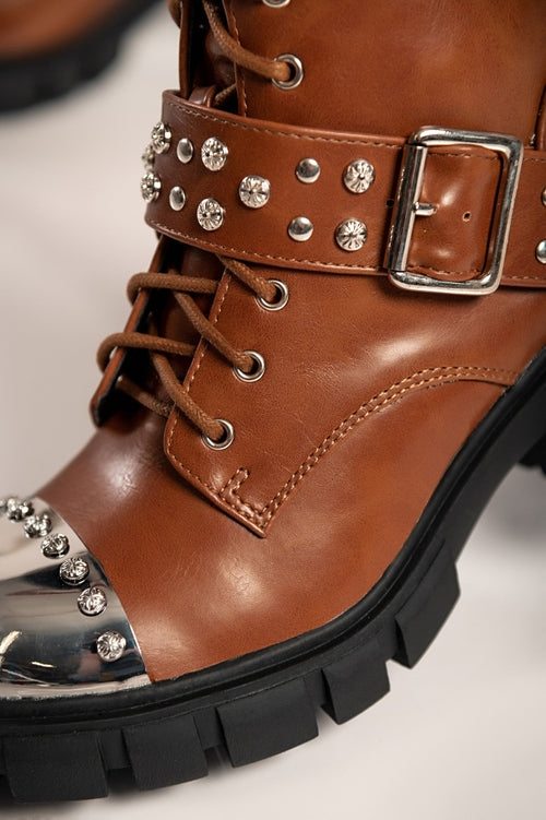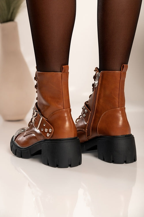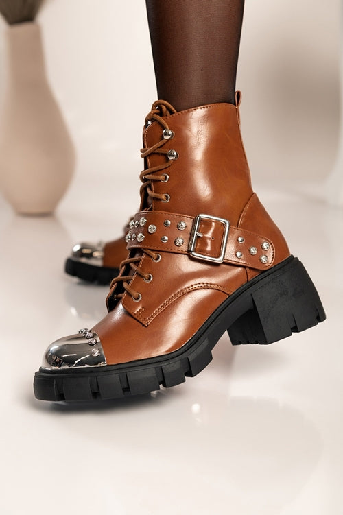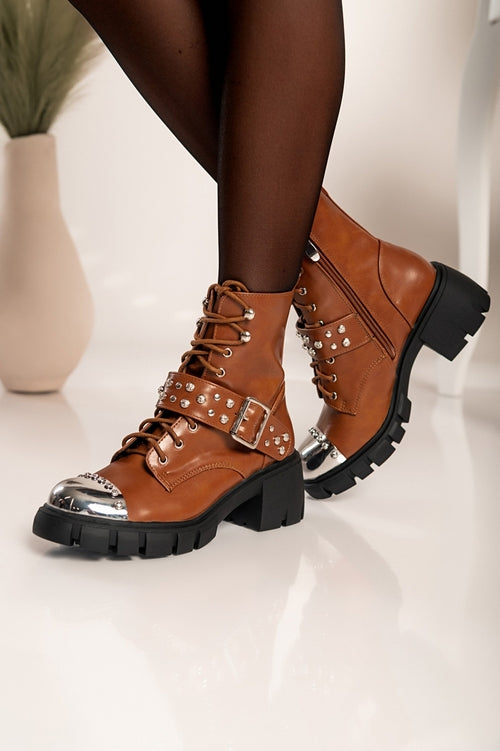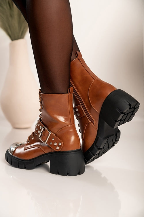Elegantni gležnarji z visoko peto so izdelani iz umetnega usnja visoke kakovosti, ki zagotavlja popolno udobje med hojo. Gležnarji imajo okroglo konico s kovinsko kapico in kovicami. Gležnarji imajo okroglo peto in zapiranje z zadrgo na notranji strani. Na sprednji strani se zavezujejo z vezalkami. Na voljo do velikosti 41.