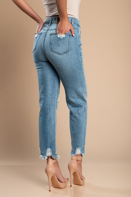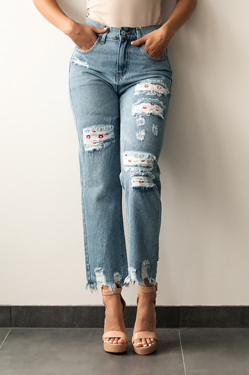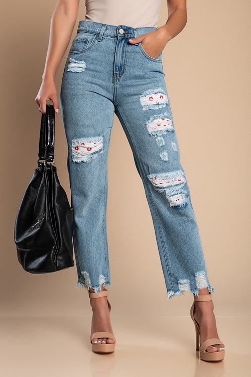 Modne kavbojke so izdelane iz visokokakovastnega bombaža, ki nudi popolno udobje pri nošenju. Kavbojke imajo srednji pas in ravni hlačnici z modnimi razporki z rožastim vzorcem in razcefranim robom. Zapirajo se z zadrgo in gumbom in imajo žepe na sprednji in zadnji strani. Artikel ja na voljo tudi v večjih velikostih do 2XL in je primeren za močnejše postave. Kavbojke se odlično podajo k tvoji najljubši majici ali bluzi.